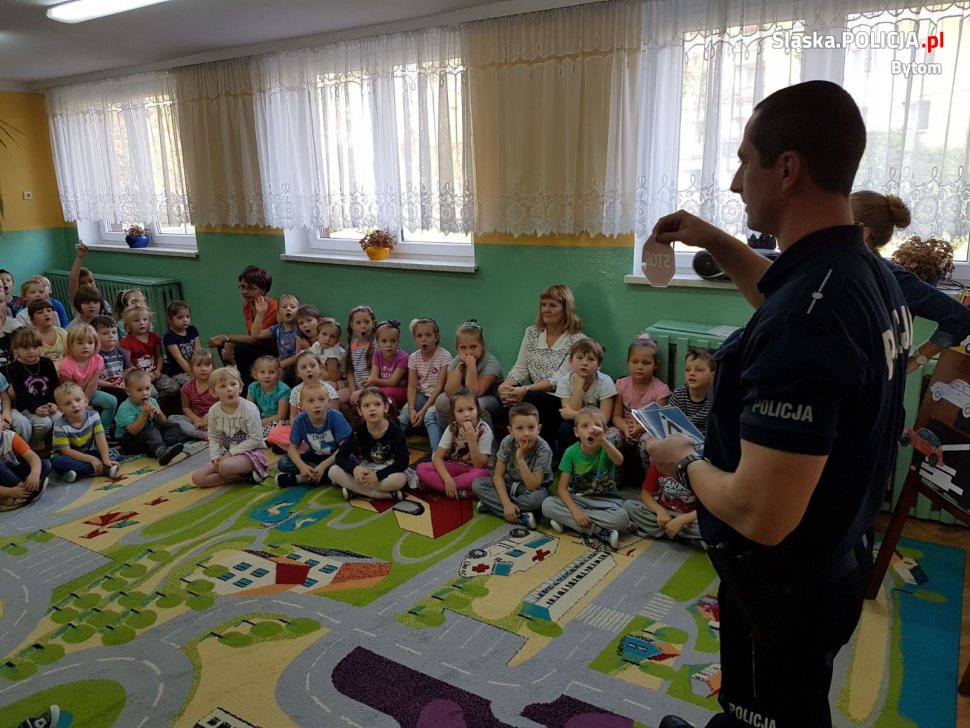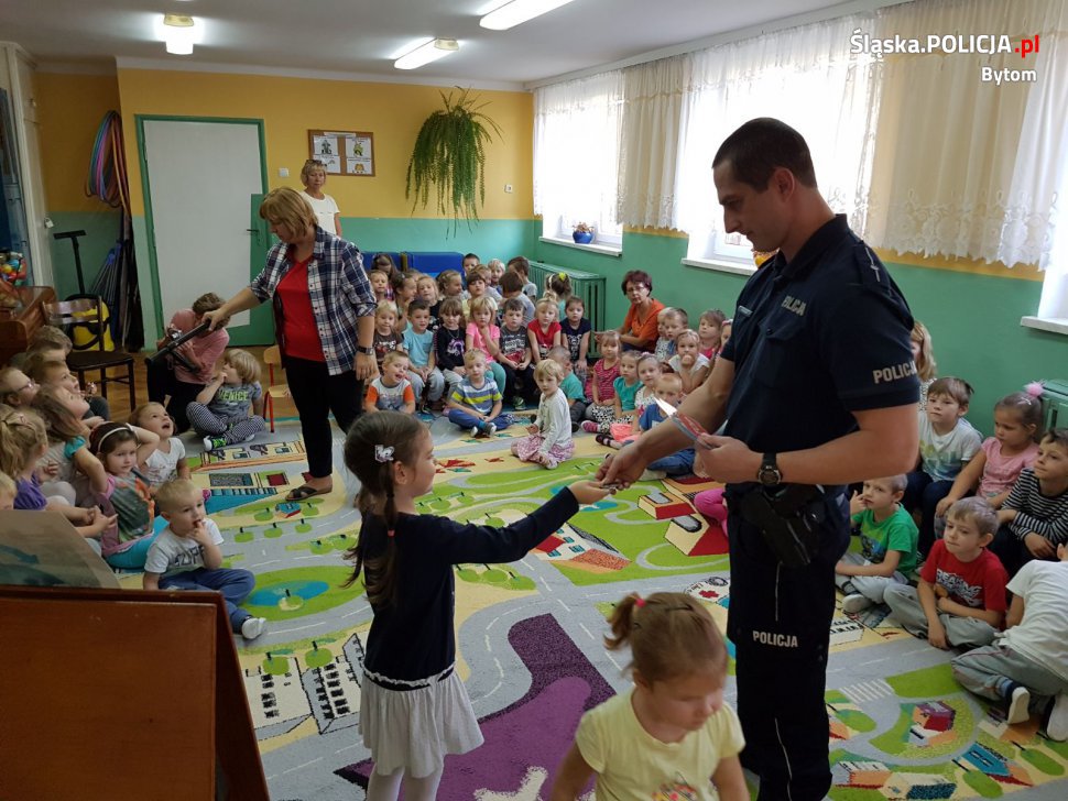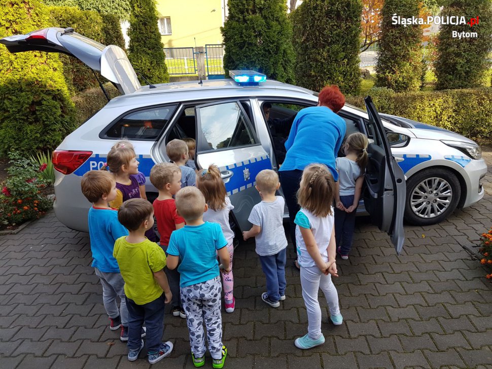 Bytomscy dzielnicowi z komisariatu w Stroszku odwiedzili najmłodszych w przedszkolu przy ulicy Tysiąclecia. W czasie spotkania mundurowi uczyli dzieci, jak unikać zagrożeń i bezpiecznie poruszać się po drodze. Poruszono temat bezpieczeństwa dzieci podczas zabaw na podwórku, przejazdu samochodem i kontaktach z obcymi. Najmłodsi z dużym zaangażowaniem uczestniczyli w prelekcji. Chętnie odpowiadali na pytania i z ciekawością słuchali tego, co mają do powiedzenia stróże prawa. Na zakończenie wszyscy mieli okazję zobaczyć radiowóz oraz sprzęt, którym na co dzień posługują się policjanci.
