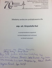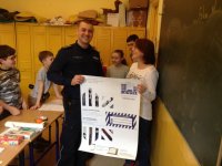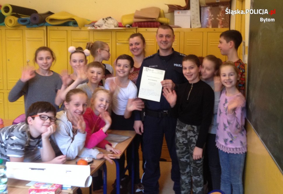 Bytomscy stróże prawa z komisariatu przy ul. Rostka w ramach akcji "Bezpieczne Ferie 2018" odwiedzili uczniów w Ogólnokształcącej Szkole Baletowej przy ul. Jagiellońskiej w Bytomiu. W trakcie spotkania mundurowi uczyli dzieci, jak unikać zagrożeń i bezpiecznie poruszać się po drodze. Przypomnieli o konieczności noszenia elementów odblaskowych oraz przestrzegania zasad bezpieczeństwa podczas zabaw na podwórku, przejazdu samochodem i w kontaktach z obcymi. Dzielnicowi przekazali podstawowe informacje dotyczące ich bezpieczeństwa podczas zbliżających się ferii zimowych. Przypomnieli zasady bezpiecznego przebywania w domu pod nieobecność rodziców. Przestrzegli przed wchodzeniem na lód oraz o ostrożności podczas zabaw ze śnieżkami. Uczniowie z ogromnym zaangażowaniem przysłuchiwali się mundurowym oraz zadawali liczne pytania.
