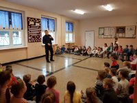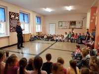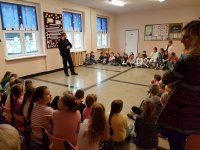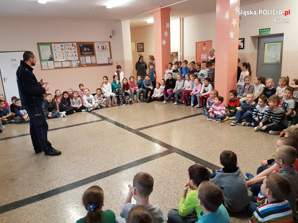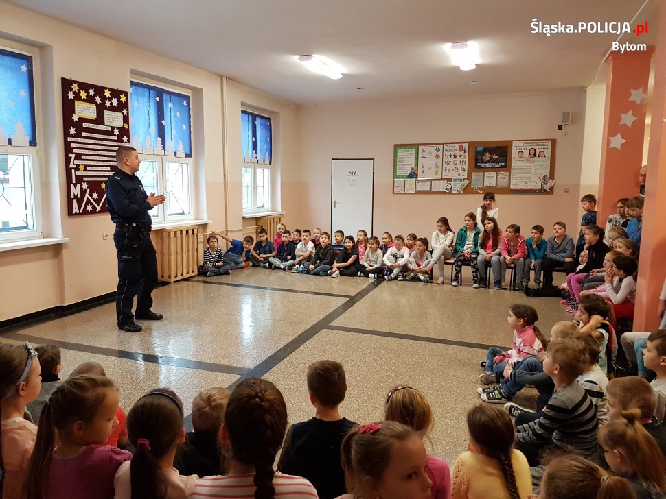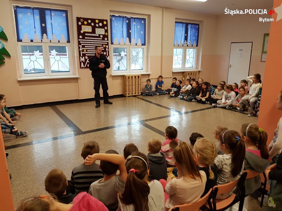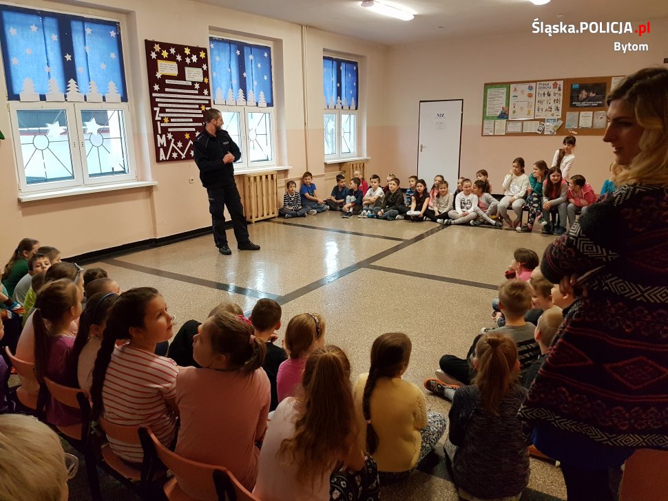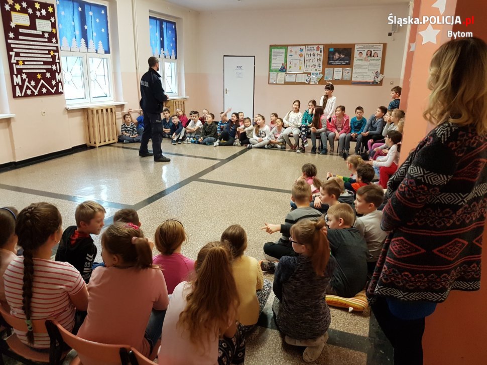Bytomscy stróże prawa z komisariatu w Stroszku w ramach akcji "Bezpieczne Ferie 2018" odwiedzili uczniów w szkole podstawowej przy ul. Wojciechowskiego w Bytomiu. W trakcie spotkania mundurowi uczyli dzieci, jak unikać zagrożeń i bezpiecznie poruszać się po drodze. Przypomnieli o konieczności noszenia elementów odblaskowych oraz przestrzegania zasad bezpieczeństwa podczas zabaw na podwórku, przejazdu samochodem i w kontaktach z obcymi. Dzielnicowi przekazali podstawowe informacje dotyczące ich bezpieczeństwa podczas zbliżających się ferii zimowych. Przypomnieli zasady bezpiecznego przebywania w domu pod nieobecność rodziców. Przestrzegli przed wchodzeniem na lód oraz o ostrożności podczas zabaw ze śnieżkami. Uczniowie z ogromnym zaangażowaniem przysłuchiwali się mundurowym oraz zadawali liczne pytania.