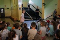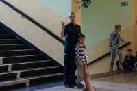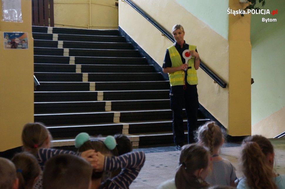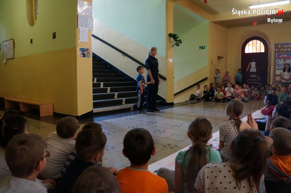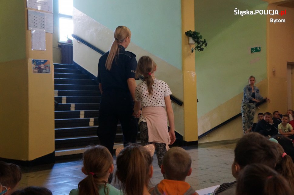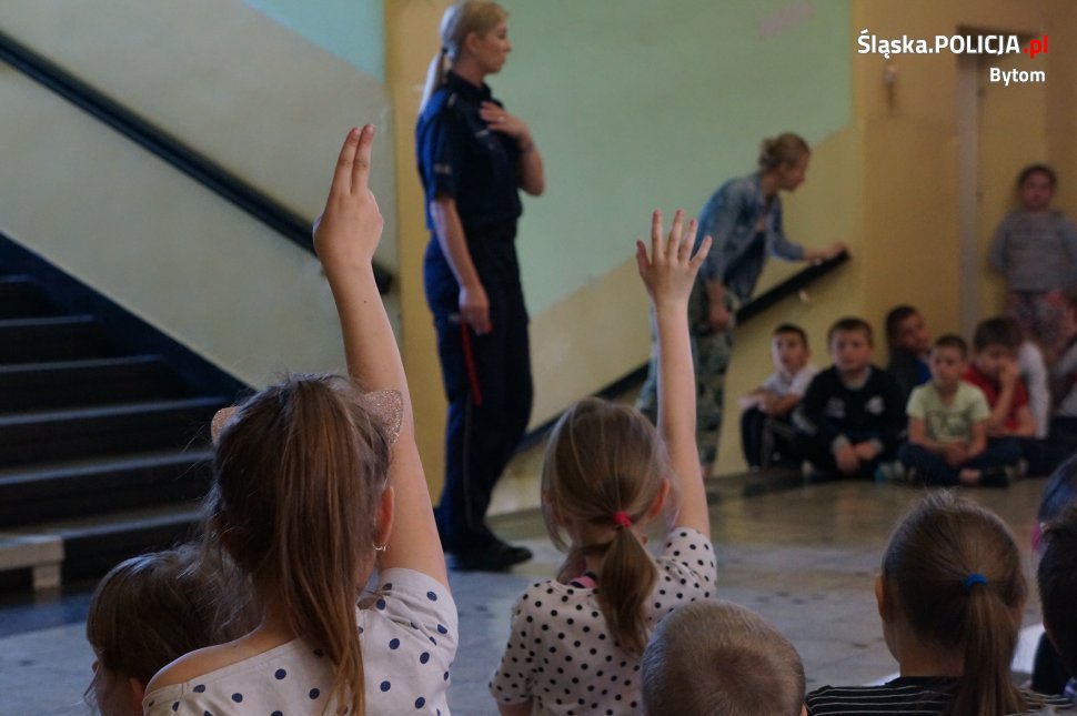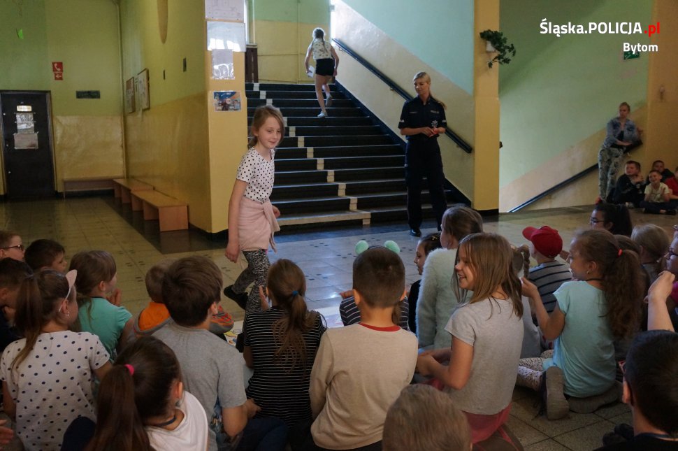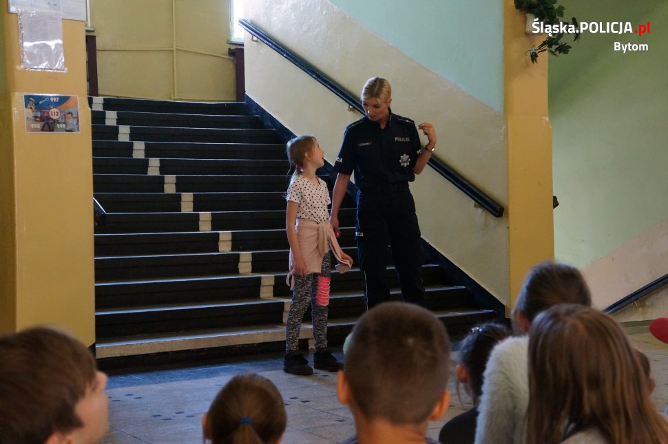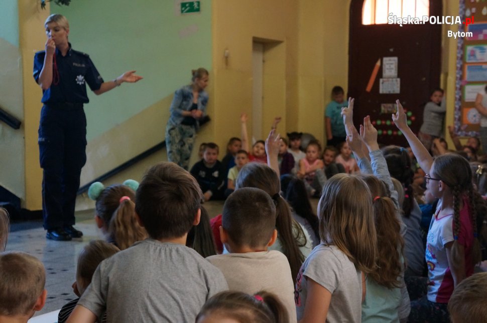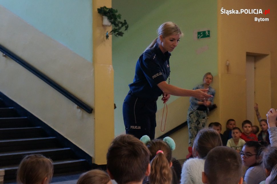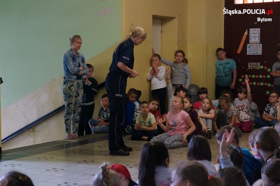 Bytomscy policjanci odwiedzili szkołę podstawową przy ulicy Królowej Jadwigi. W czasie spotkania mundurowi rozmawiali z uczniami i przekazali informację dotyczące ich bezpieczeństwa podczas zabaw na dworze oraz poruszania się po drodze. Poruszono temat agresji wśród młodzieży oraz wulgarnego i agresywnego zachowania na terenie szkoły w stosunku do innych uczniów, jak i nauczycieli oraz pracowników szkoły. Policjanci przypomnieli uczniom, że nauczyciel jest funkcjonariuszem publicznym tak samo jak stróże prawa. Policjanci przypomnieli o konieczności noszenia odblasków na ubraniu lub na plecakach. W szczególności gdy chodzą po zmroku. Mundurowi starali się uwypuklić dzieciom jak ważne jest używanie elementów odblaskowych podczas spacerów gdy jest już ciemno oraz poza terenem zabudowanym. Policjanci informują jak ważne jest używanie elementów odblaskowych podczas jazdy na rowerze. Zaznaczają, że nasze bezpieczeństwo jest najważniejsze i w dużej mierze zależy od Nas samych a elementy odblaskowe pozwalają kierowcą szybciej dostrzec rowerzystów. Uczniowie z dużym zaangażowaniem uczestniczyli w spotkaniu. Chętnie odpowiadali na pytania i z wielkim zainteresowaniem słuchali prelekcji.
