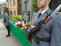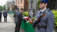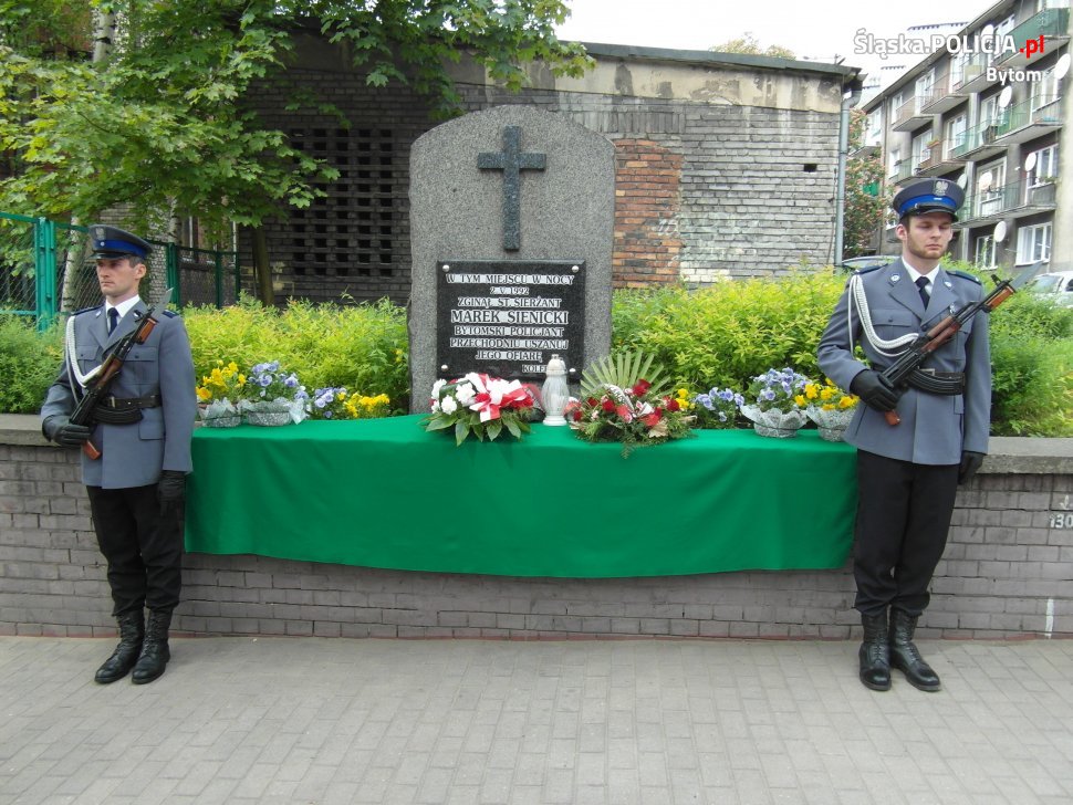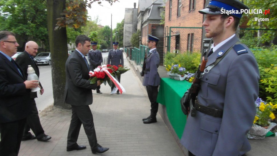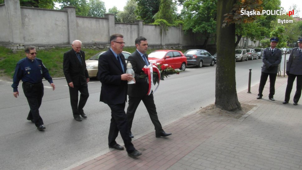 Pierwszy Zastępca Komendanta Miejskiego Policji w Bytomiu podinsp. Dariusz Dziurka, w towarzystwie ojca Marka Sienickiego, Prezydenta Bytomia, kapelana ks. Joachima Gondro oraz jednego z radnych, złożyli kwiaty i zapalili znicze.