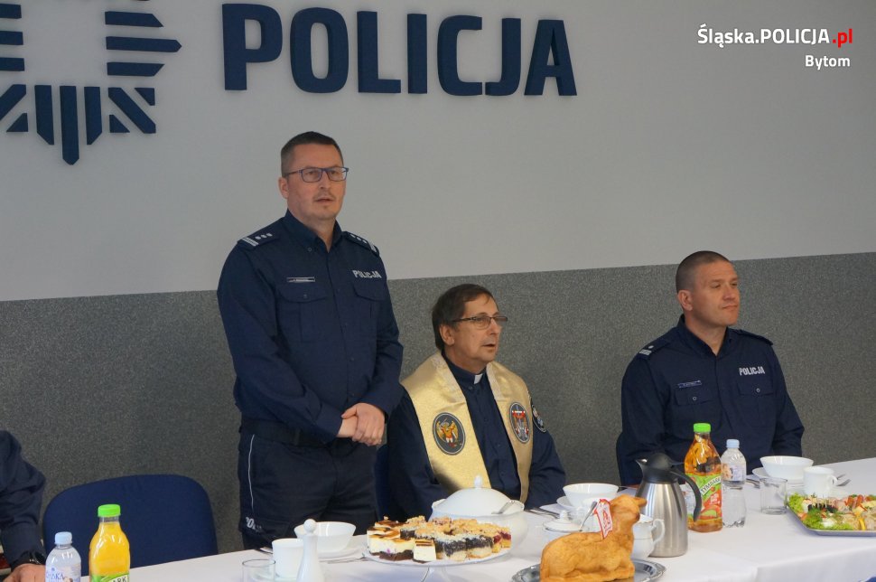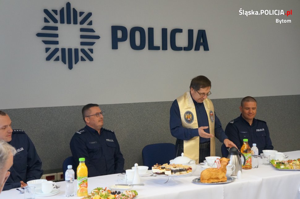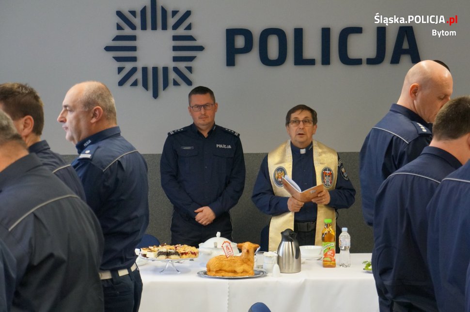 Nadchodzą Święta Wielkiej Nocy. Na tę okoliczność w tutejszej komendzie odbyło się spotkanie kierownictwa garnizonu bytomskiej policji z przedstawicielami pracowników cywilnych. Zaproszeni goście mieli okazję złożyć sobie życzenia i usiąść przy wspólnym symbolicznym wielkanocnym stole. Obecny był również ksiądz kapelan Joachim Gondro.