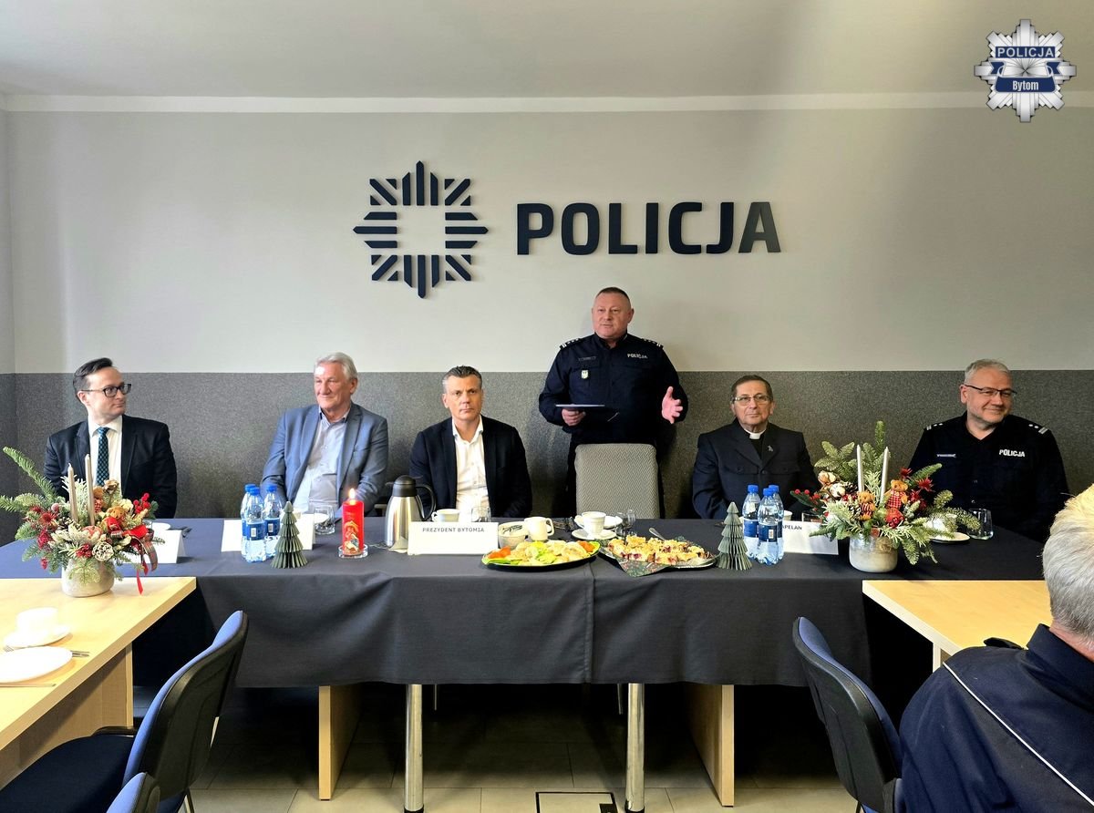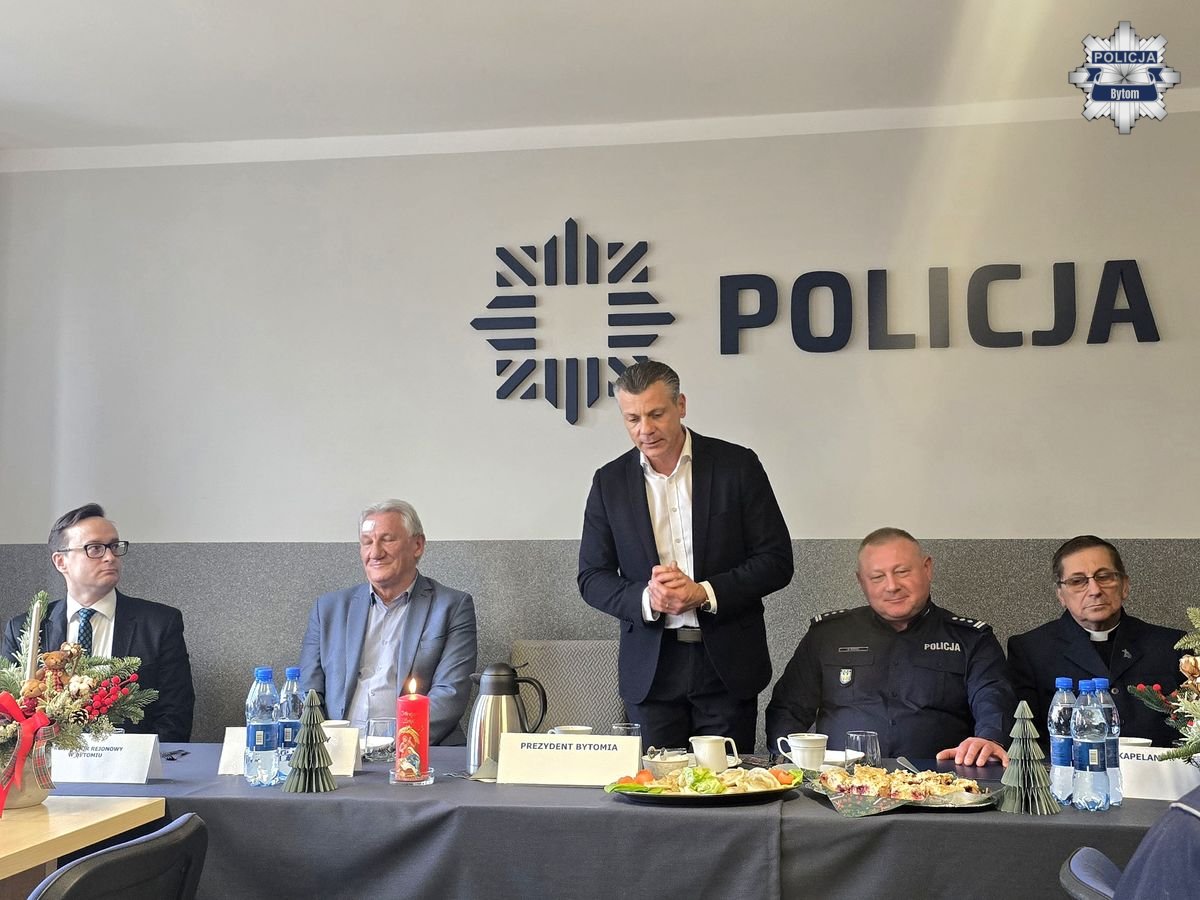 Uroczyste spotkanie rozpoczął Komendant Miejski Policji w Bytomiu inspektor Dariusz Kopeć od złożenia świątecznych życzeń policjantom, pracownikom cywilnym oraz ich rodzinom. Podziękował również wszystkim policjantom oraz pracownikom za wysiłek i zaangażowanie w codziennej służbie i pracy.