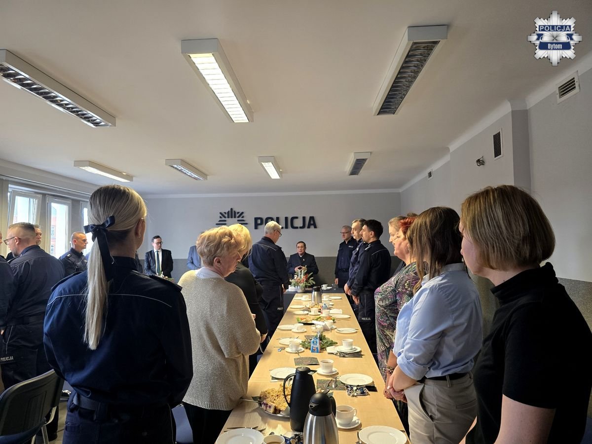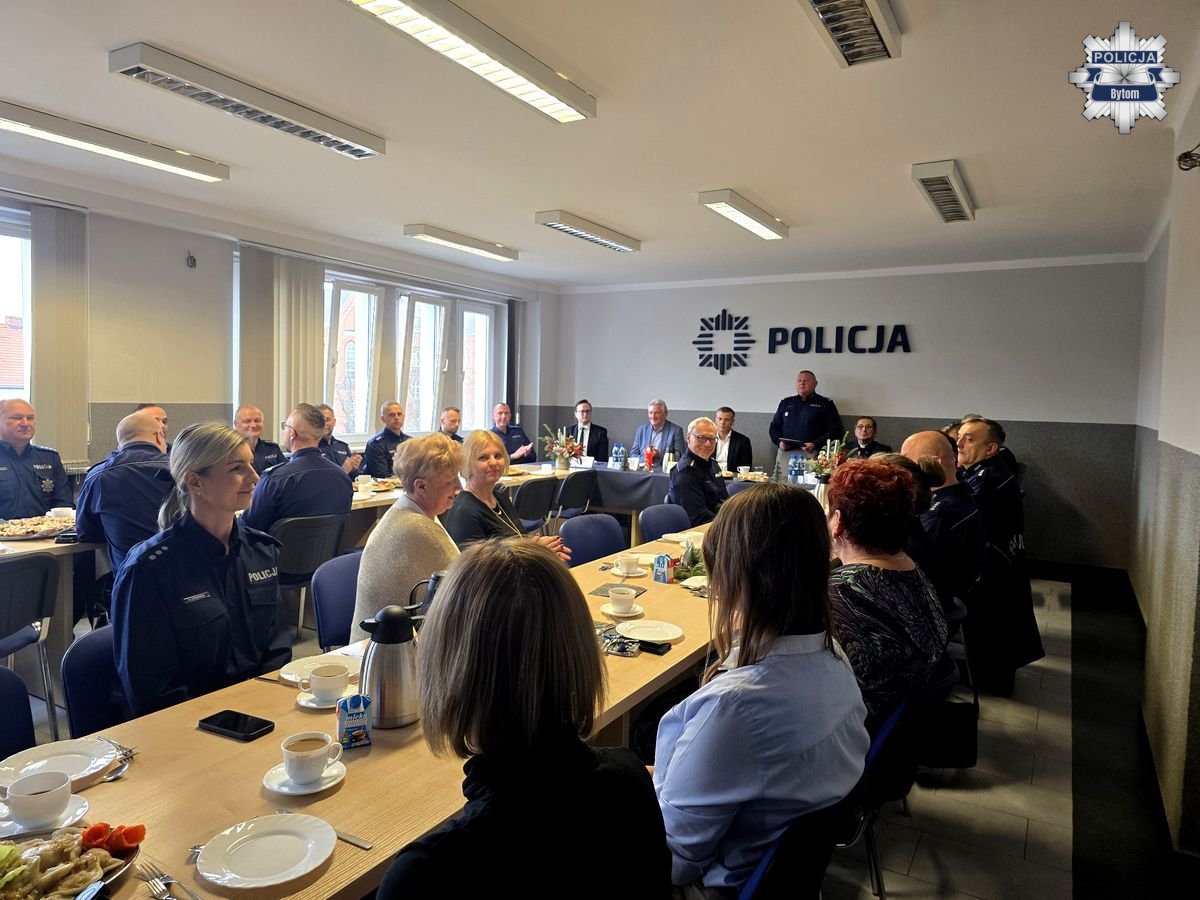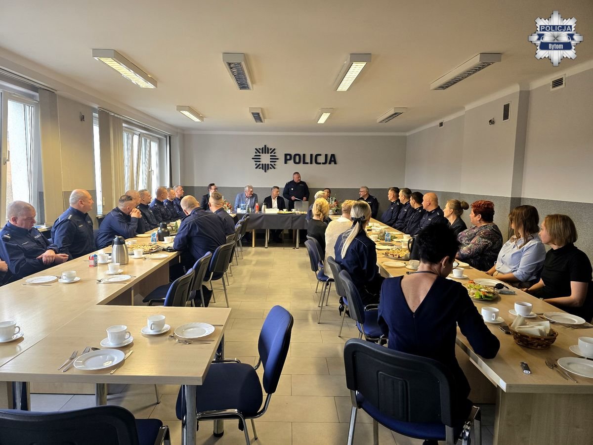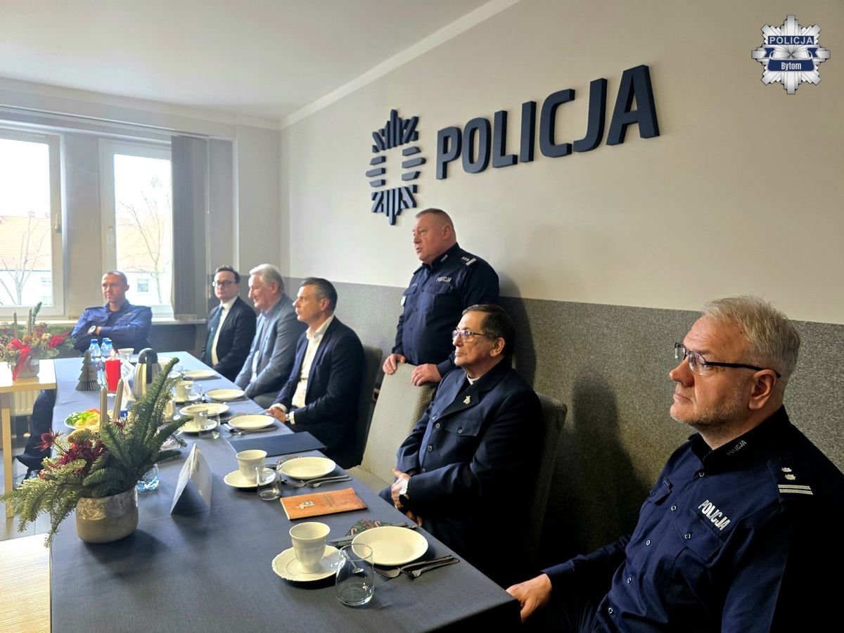 Po przemówieniach i przekazanych życzeniach uczestnicząca w spotkaniu kadra kierownicza bytomskiej jednostki, przedstawiciele pracowników korpusu cywilnego Policji oraz zaproszeni goście zasiedli do wigilijnego stołu.